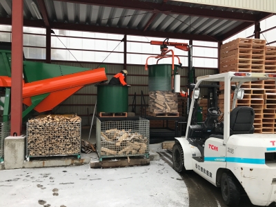 効率化には薪割りの自動化も大事ですが、薪の梱包が鍵です。