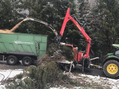 雪の中、幅3m未満の狭い道路に370馬力のジョンディア8シリーズと38立米入るトレーラーを引っ張って215馬力のジョンディア6シリーズが山道をドンドン登って行きます。トレーラーに直接チップを吹き込むために、山道をバックで上がって行き、チッパーと20cmくらいの間隔で駐車するドライビングテクニックが凄くて見とれました。