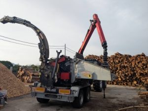 鹿児島県では鰹節の製造に使用する薪の需要が高く、山の現場から直接鰹節工場に薪を出荷するという事で、このような現場で自由に小回りのきく機械を選ばれました。