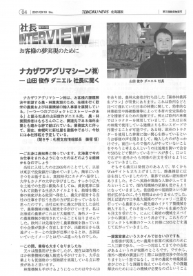 帝国ニュース 北海道版 掲載 2021/03/23 12:10 雑誌掲載情報 先日、「帝国ニュース 北海道版」に弊社代表のインタビューが掲載されました。 是非、ご覧ください!! « 一覧へ戻る » PICK UPおすすめの記事 直播ビートプランター 2024/04/26 11:33 売約済み商品 ホップ専用トラクター納品 2016/06/20 13:54 新着News Instagram公式アカウント開設のお知らせ 2025/02/14 17:07 新着News