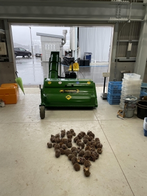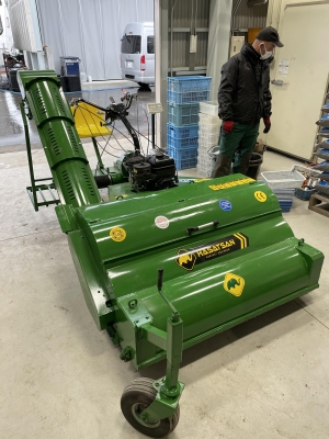 韓国製の収穫機は、トラクターのPTO駆動となっており、吸入用ホースが取付られておりまして、ホースでクリを吸い込んだ後に、エアーでイガと不純物を取り除いて、イガは外に出し、果実だけを3種類のサイズに分けて収穫するという優れものとなっております。