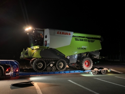 苫小牧港に陸揚げされたコンバインをトレーラーに積み、トレーラーの前後に弊社とお客様で誘導車をつけて夜中に積丹町まで搬送しました。