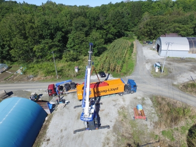 今回でお客様は計3台目となるNuhnのタンカーの導入ですが、今回は極力輸送経費を抑えたいというご要望を受けて、コンテナのままお客様の農場まで運び、現場で荷下ろし及び組立を行いました。