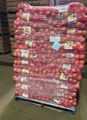 牧草を梱包するネットで全自動で玉ねぎをパレットに載せて梱包していました。