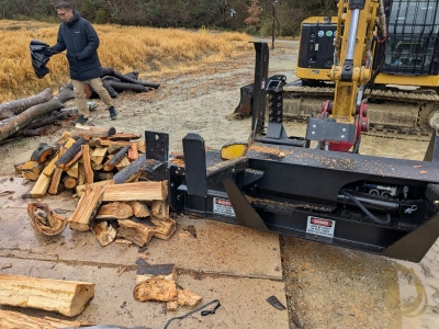パワーショベルに装着される場合は、ブームを動かしてカゴパレットなどに落とすように薪割りされるのもありです。
