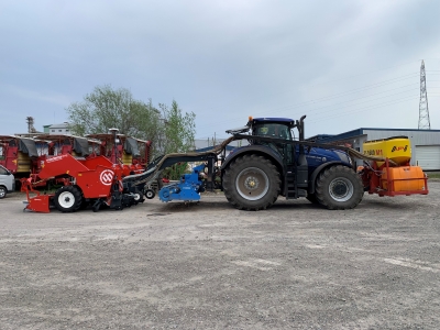 トラクターのフロントに施肥機を装着し、リアにパワーハローと今回のプランターを繋げたことで、一台三役の機械となります。