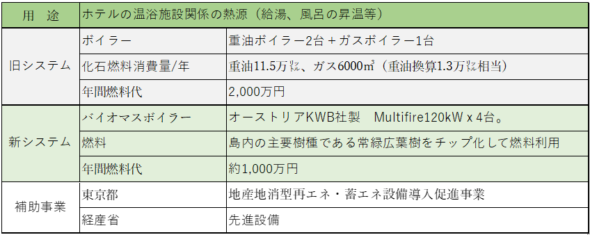 東京都八丈島のリゾートホテル「リードパークリゾート八丈島」に、オーストリア製の木質バイオマスボイラーを導入し、ボイラー熱で大浴場や客室暖房などのエネルギーを賄う取り組みです。