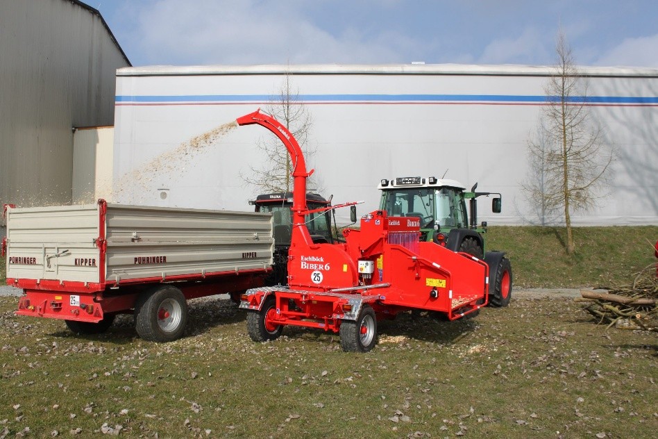 チッパー Biber6(オーストリア製)(写真左)、生産されたチップ(写真右)