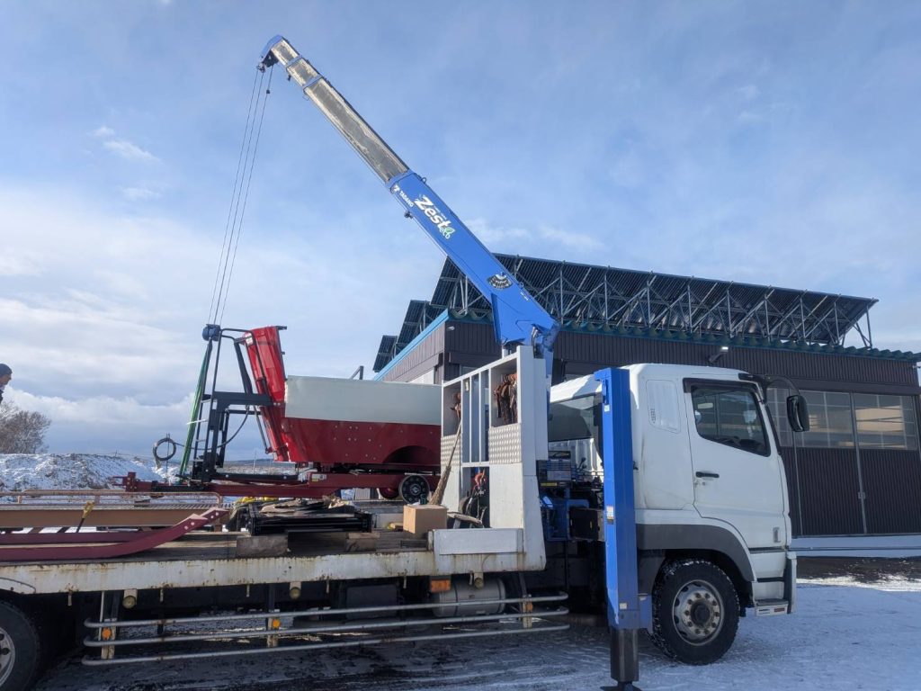 弊社の優秀なメカニックがどのような手順が最も安全かを現場で確認しながら、リフトとクレーンを併用して慎重に荷下ろしを実施。事故やトラブルもなく、無事に作業を完了することができました。